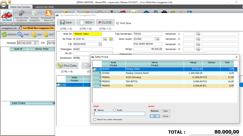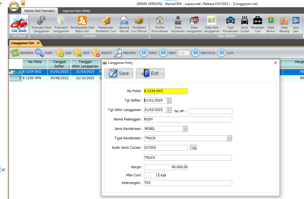 Berikut adalah beberapa menu di aplikasi Software Jasa Usaha Cuci Kendaraan: